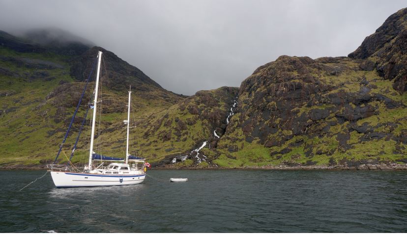 Nous longeons l’archipel des Hébrides extérieures vers le nord et nous nous arrêtons dans un mouillage incroyable déniché sur le guide, Acarseid Fhalaich dans Flodday sound au nord de Benbecula. Il y a de la place pour un voilier, la protection est totale et les cartes UKHO et Navionics disent qu’il n’y a pas d’eau dans l’entrée étroite, seuls ce guide et les cartes Antares nous permettent de le rejoindre en sécurité. C’est magnifique !