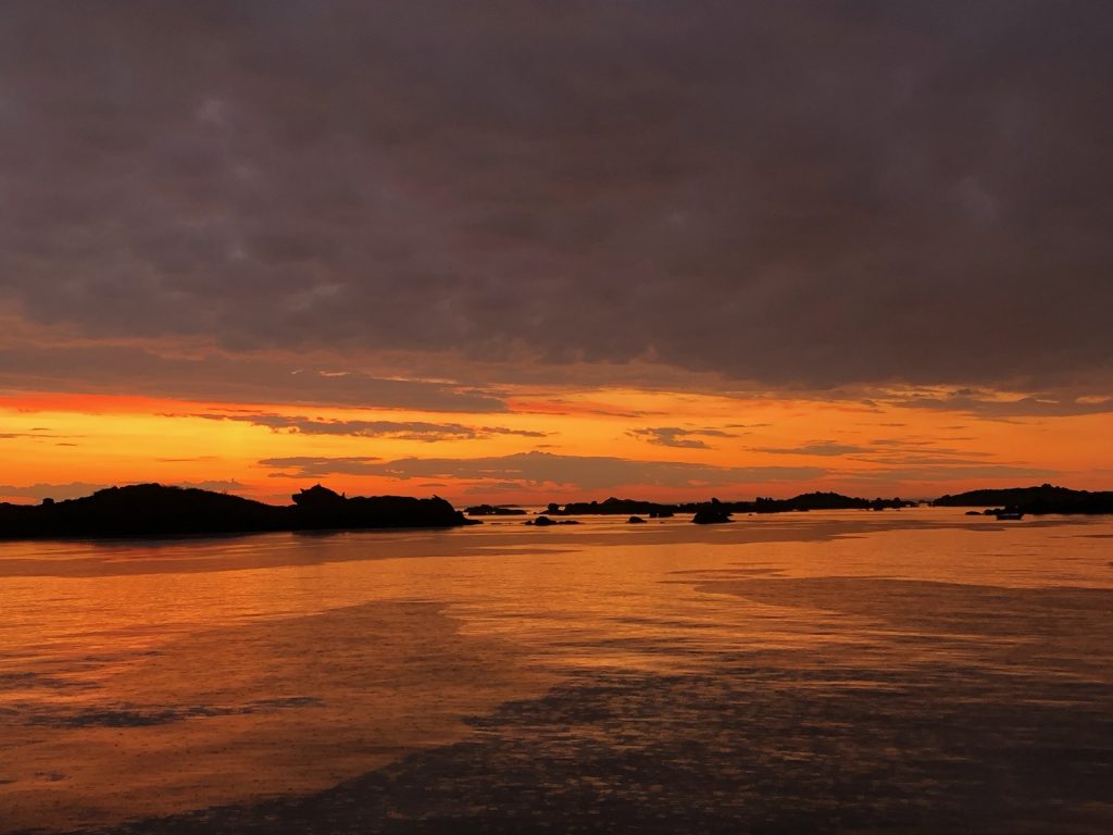Pour l’instant, pas de vent – nous irons au moteur jusqu’aux Minquiers où nous pénétrons par la passe du Coq. Après un petit slalom entre les cailloux qui commencent à émerger à marée descendante nous mettons les quatre bateaux à couple sur la tonne de l’Île Maitresse vers 10:10 (GMT+1).